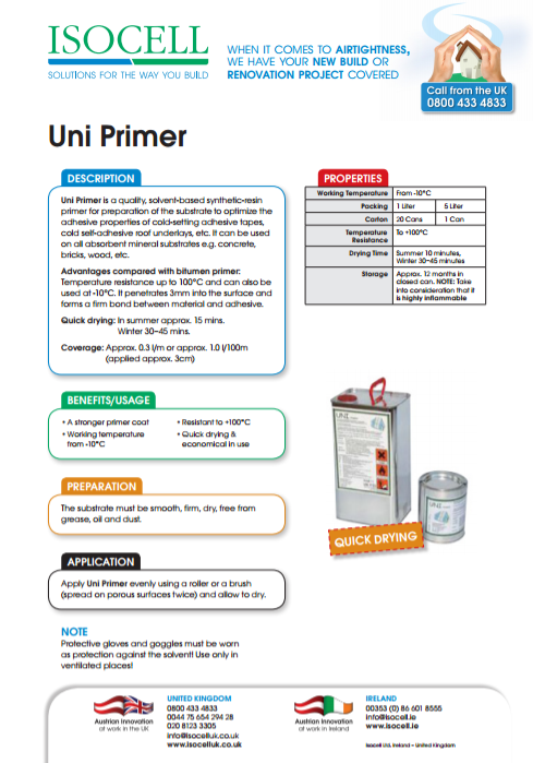A solvent-based synthetic-resin primer, for preparation of porous substrates such as masonry and concrete to optimise the bond of cold-setting adhesive tapes, and cold self-adhesive roof underlays. Penetrates up to 3mm into the surface. Fast curing. particularly recommended in winter! yield: Approx. 5 m²/litre